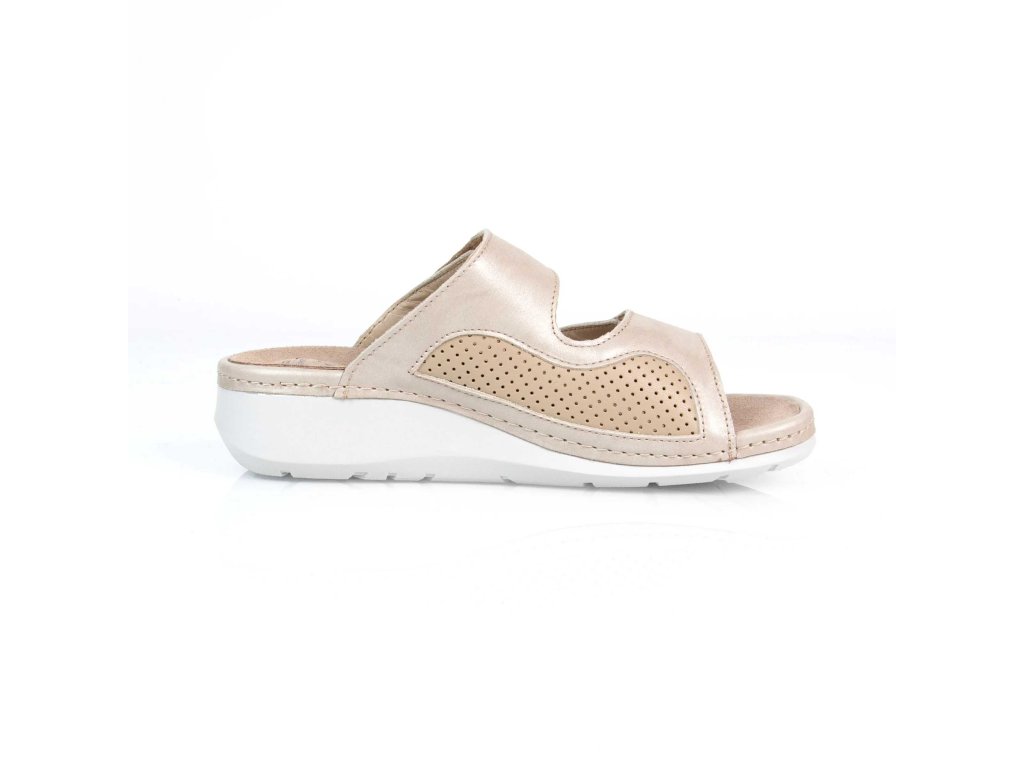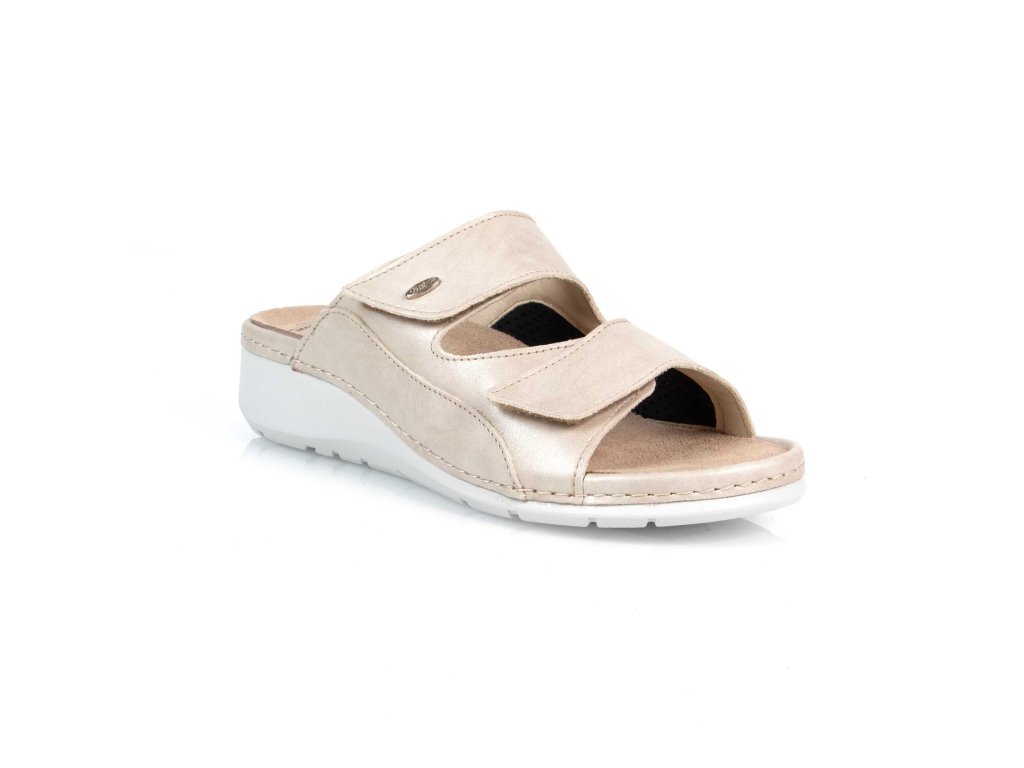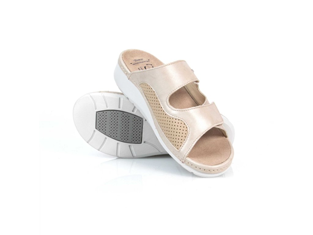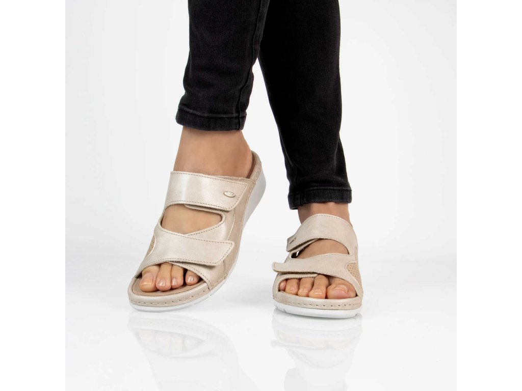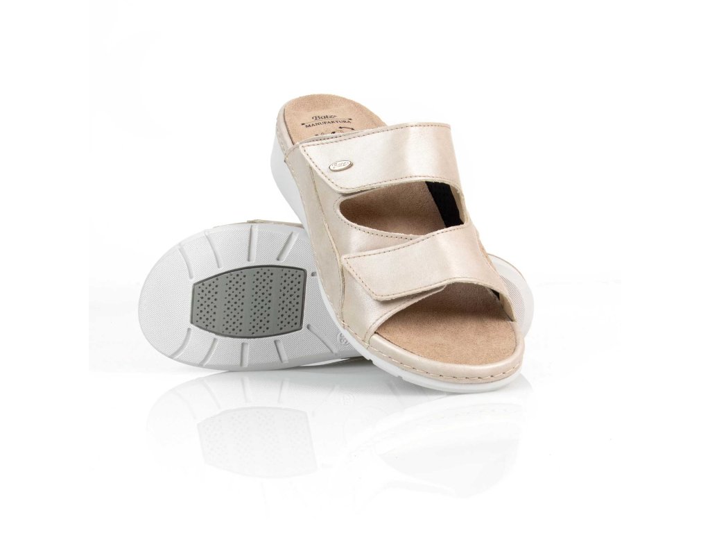 Dámské kožené pantofle TRUDI z řady BATZ v barvě béžové jsou díky své neutrální barvě dokonalou volbou, kterou lze snadno kombinovat s jakýmkoliv oděvem. Svrchní část obuvi je vyrobena z kůže, elastická vsadka zabudovaná do vnitřní části obuvi umožňuje zvýšený komfort pro osoby s Hallux Valgus. Přezky přes nárt jsou nastavitelné pomocí suchých zipů. Stélka je vyjímatelná, anatomicky tvarovaná - podporující podélnou a příčnou klenbu chodidla přirozeným způsobem a snižuje tak zátěž na chodidla.