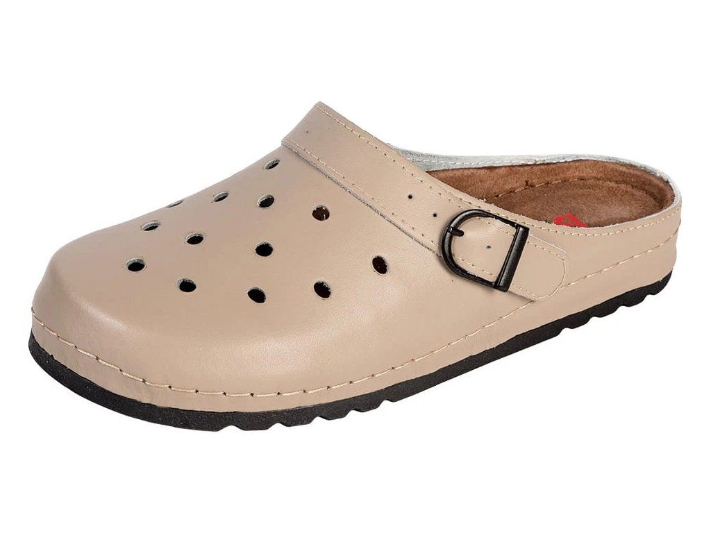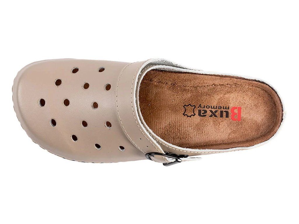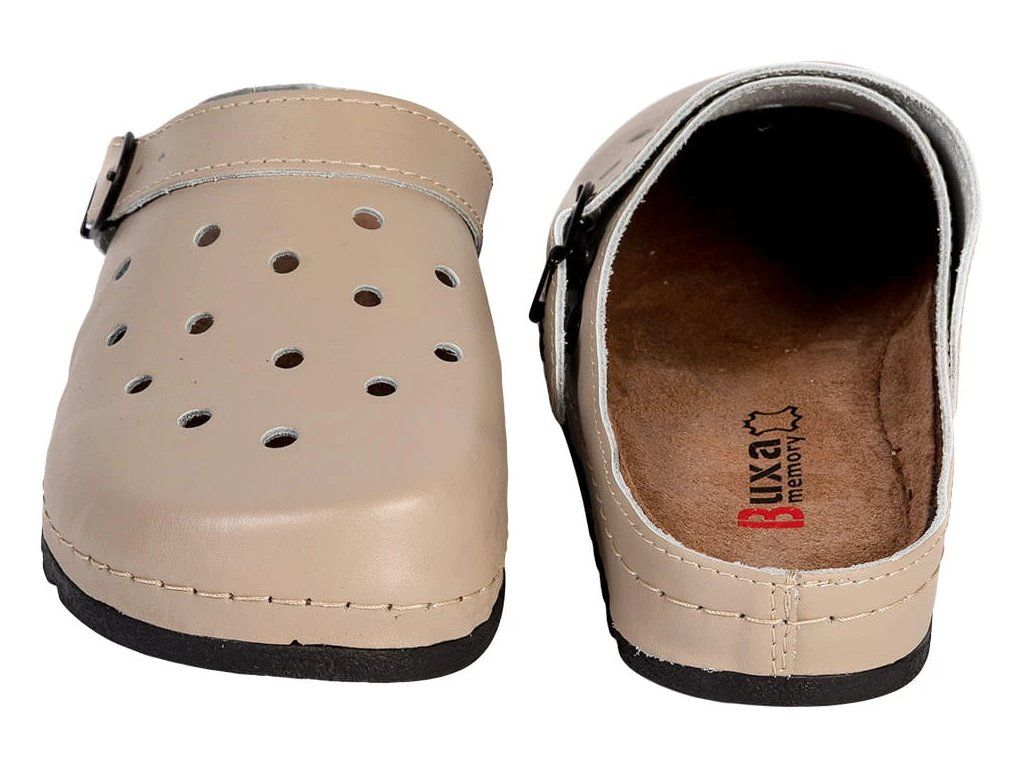 Dámská zdravotní obuv Buxa BZ131 v béžové barvě je navržena pro pohodlné celodenní nošení. Oproti běžným syntetickým EVA modelům nabízí kožený svršek a koženou stélku, které jsou příjemnější na nošení, lépe pracují s vlhkostí a působí komfortněji při delším používání.