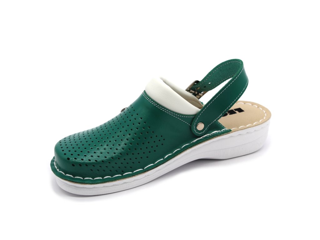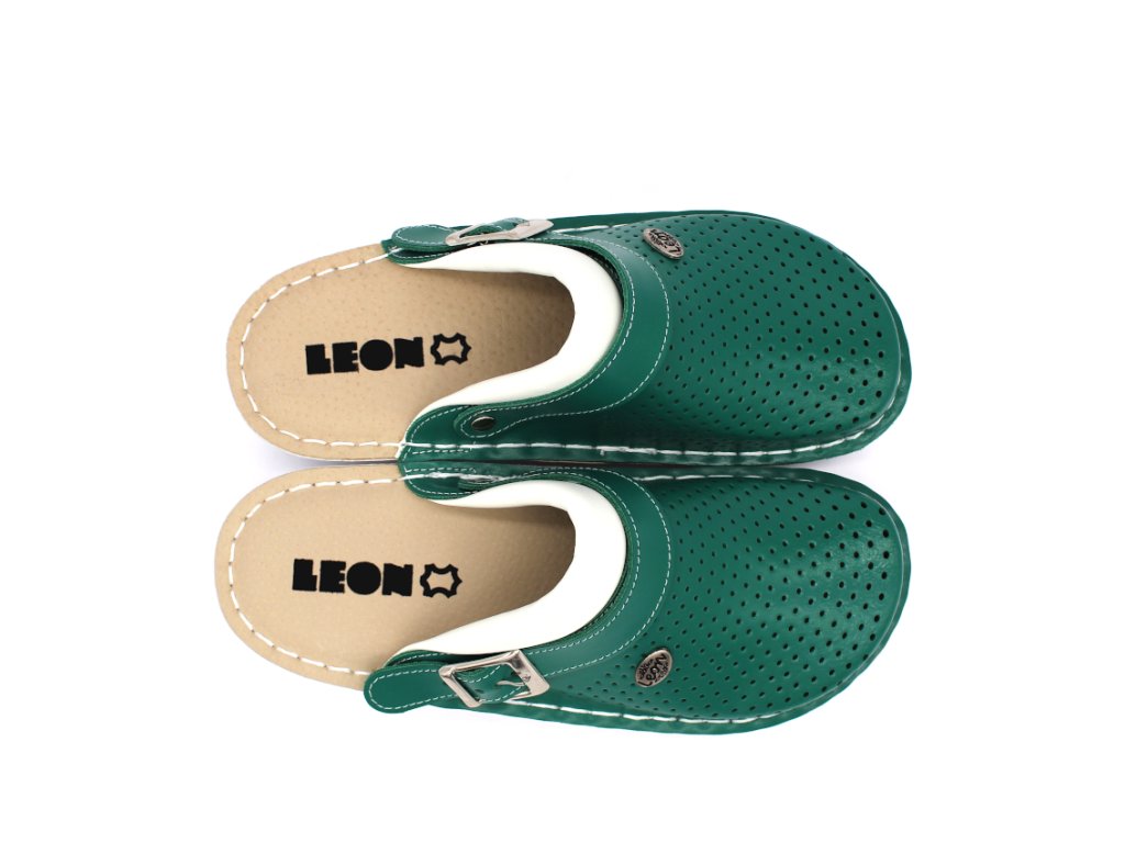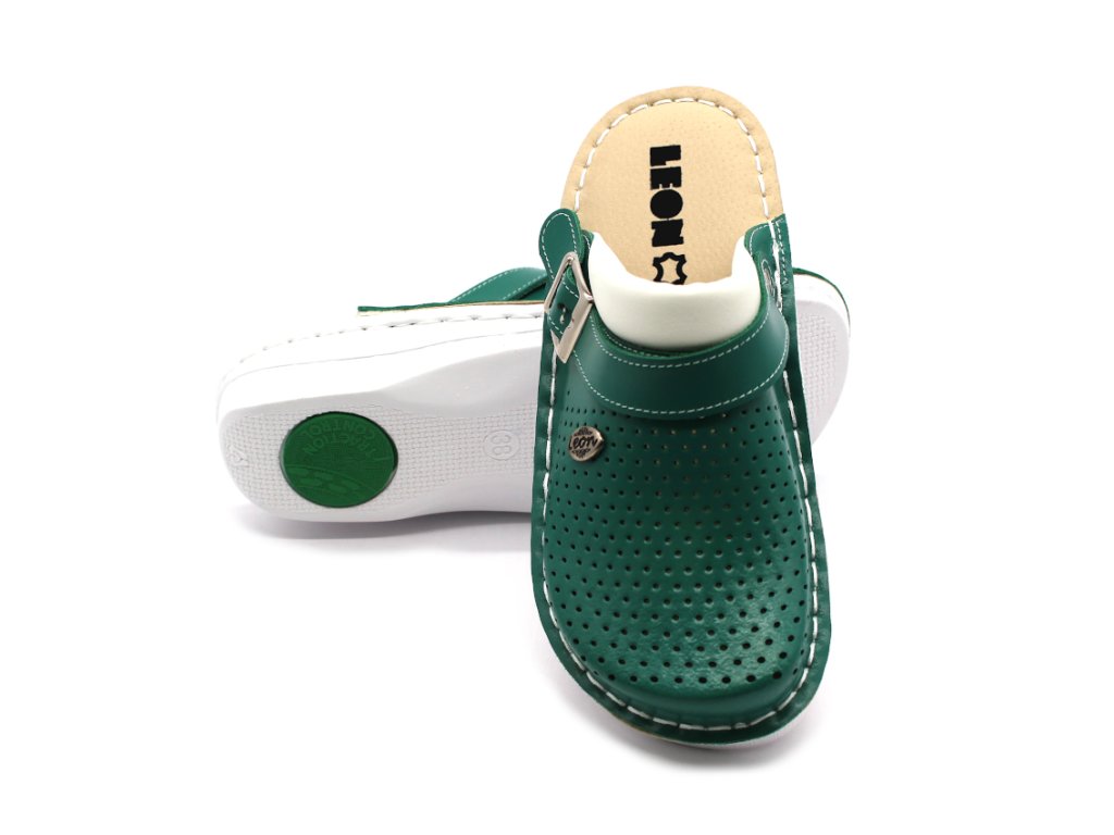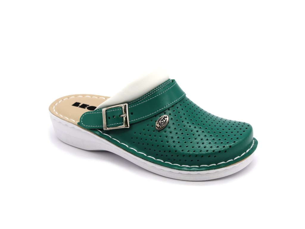 Leon V202 v zeleném provedení je pohodlná dámská pracovní obuv s uzavřenou špičkou a otevřenou patou, určená pro každodenní nošení v práci i doma.